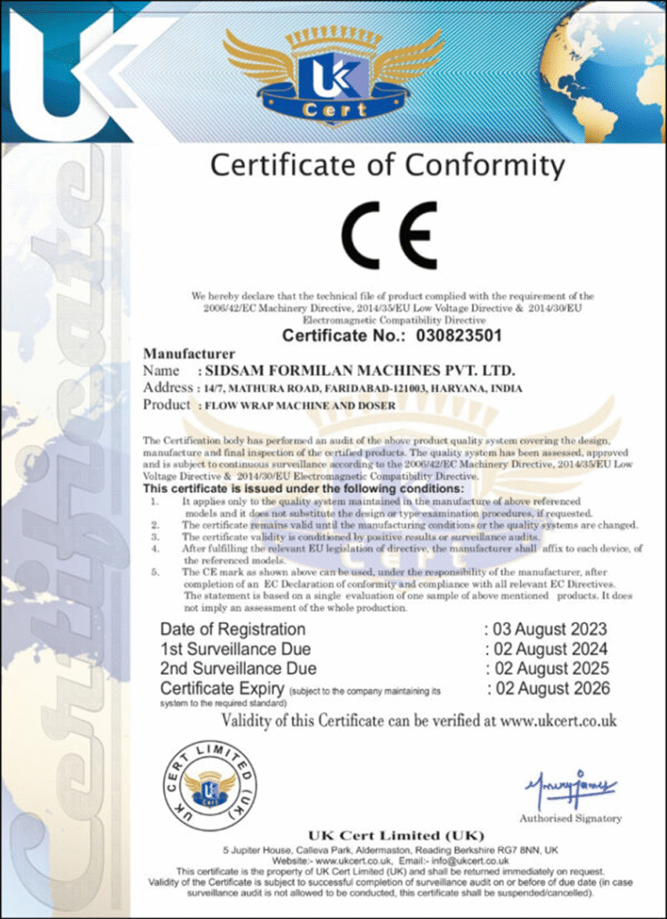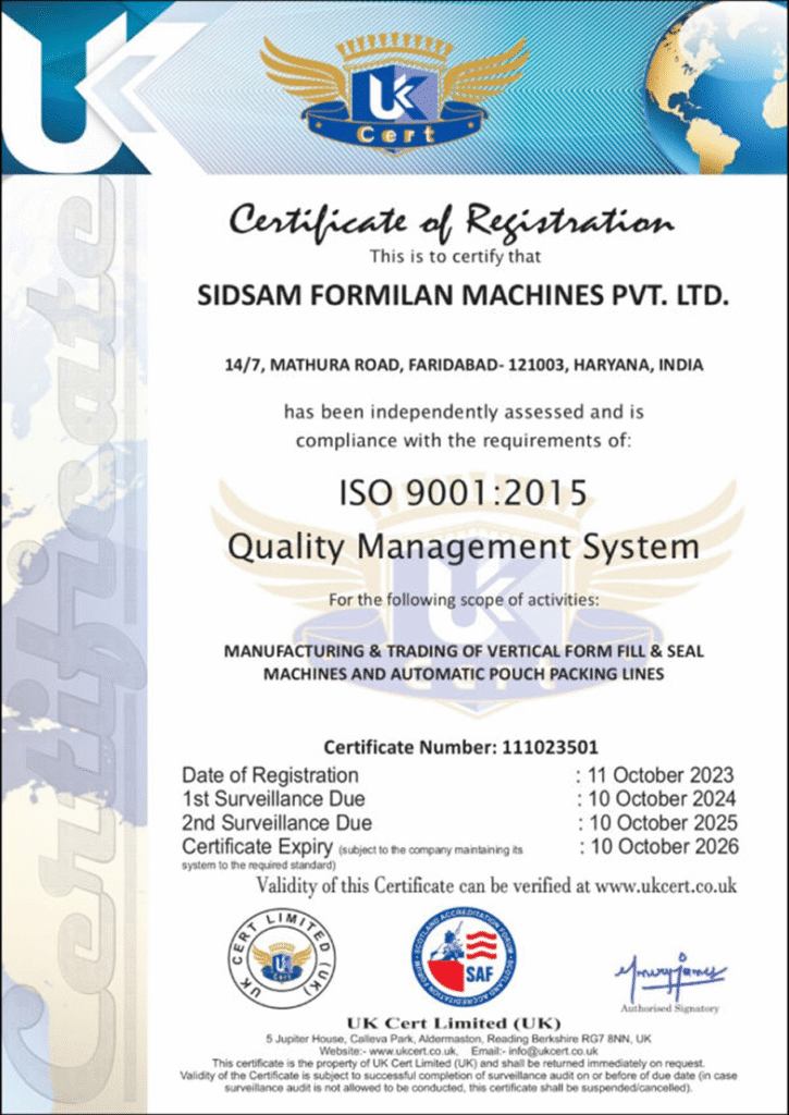 At SidSam Group, quality and compliance drive everything we do. As a global manufacturer and exporter of packing machinery, we recognize the value of earning trust through international certifications and rigorous quality standards. These certifications are more than achievements they reflect our dedication to safety, durability and worldwide compliance in every machine we produce.